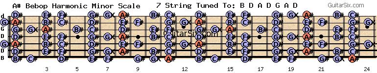 d-a-d-g-a-d a# bebop harmonic minor scale for guitar