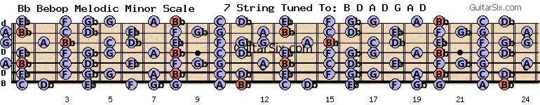 d-a-d-g-a-d bb bebop melodic minor scale for guitar