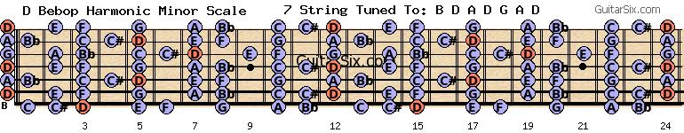 d-a-d-g-a-d d bebop harmonic minor scale for guitar
