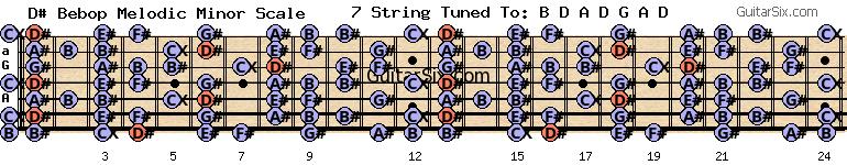 d-a-d-g-a-d d# bebop melodic minor scale for guitar