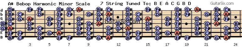 e-a-c-g-b-d a# bebop harmonic minor scale for guitar