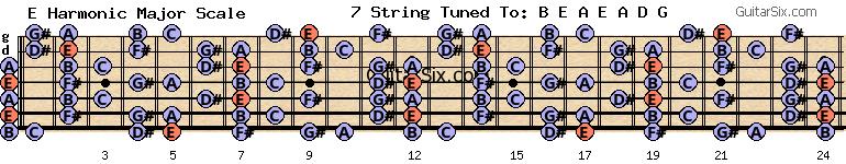 e-a-e-a-d-g e harmonic major scale for guitar