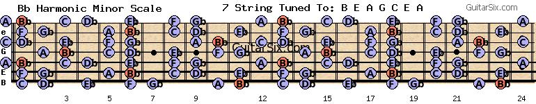 e-a-g-c-e-a bb harmonic minor scale for guitar