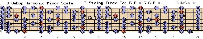 e-a-g-c-e-a d bebop harmonic minor scale for guitar